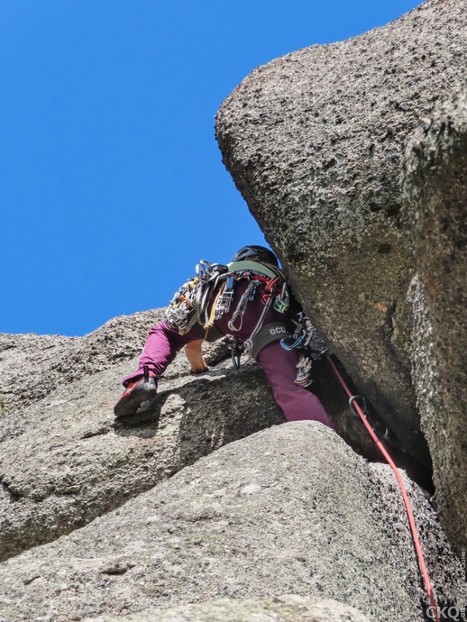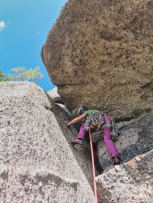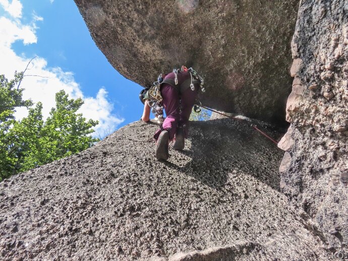 Po levé hraně jeskyňky vzhůru, koutem přes malý převis a spárou na vrchol.