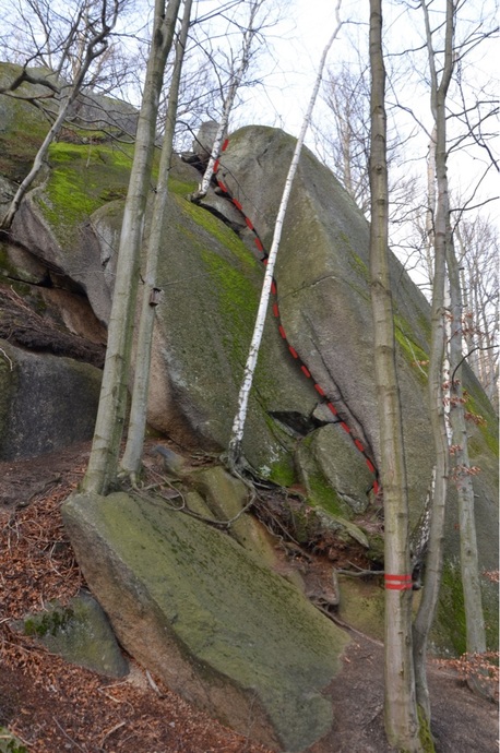 Nástup asi 3 m vlevo od Kauschkova odkazu. Výraznou koutovou spárou na balkon a dále úzkou spárou na vrchol.