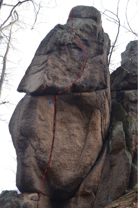 V Z stěně sokolíkem k 1. K, vpravo trhlinou a sokolíkem ke 2. K, vlevo stěnou a dolez Přes bradu.