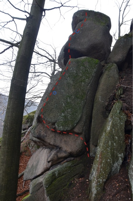 Zprava na pravou údolní hranu pilířku (borhák). Hranou do police a dále hranou přes 2. borhák přímo či stěnou mírně vpravo na vrchol pilířku.
