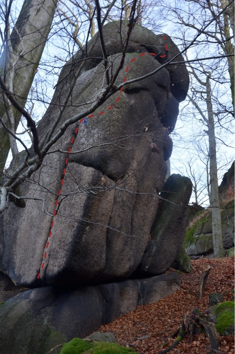 V údolní stěně spárou k 1 K a vpr. na hranu na balkon ke 2K. Mírně zleva a traverz v dřepu vpravo až ke spáře a jí na v.