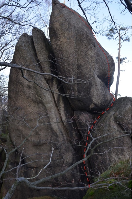 Rozpěrným komínem v levé části údolní stěny až k převislé Jižní spáře. Tou několik metrů vzhůru a vpravo do žlabu, který ústí na polici s borovicí. Odtud vpravo výšvihem přímo na vrchol.
