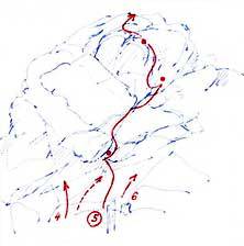 (původně P. Plachecký, P. Němec po skobách a klínech). Středem plotny pod střechu (1. K), přes ni do kouta a vpravo průlezem ke 2. K. Vlevo vodorovným zářezem v převisu (3. K) na poličku a přímo na vrchol.