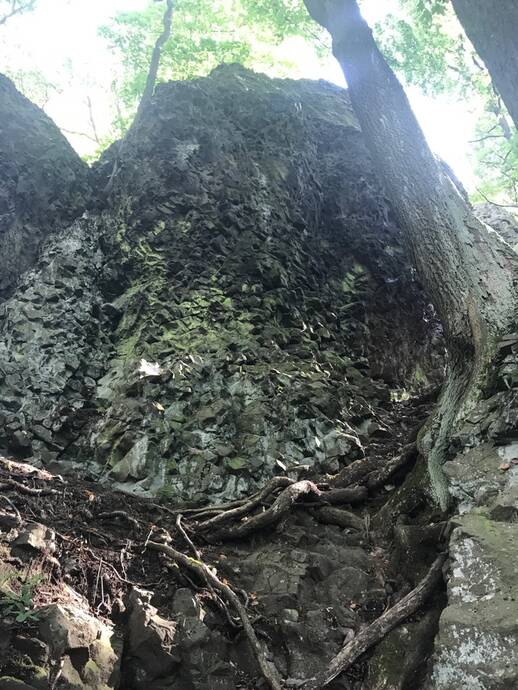 V levé části údolní stěny podél převislé spáry (2 bh), stěnou ke hraně (bh) a podél ní doprava n. v.