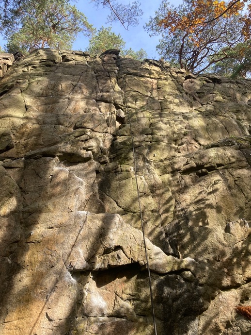 Vpravo od c. James Griwe po velkých vylomených chytech (nýt, 2 bh) kolmou stěnou ke slaňáku. Spodní část cesty je doporučeno dojistit vlastním materiálem!