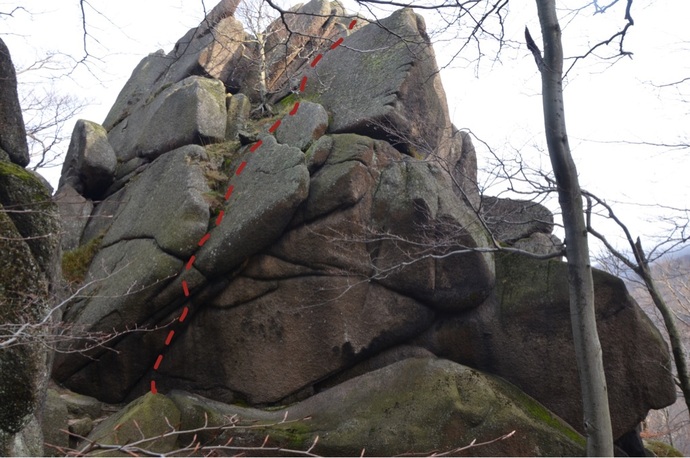 Z průchodu mezi Masívem a Sedlem vlevo z balvanu převisem šikmo do zařezu a jim do ruční spáry. Tou na plotnu a libovolně na temeno.
