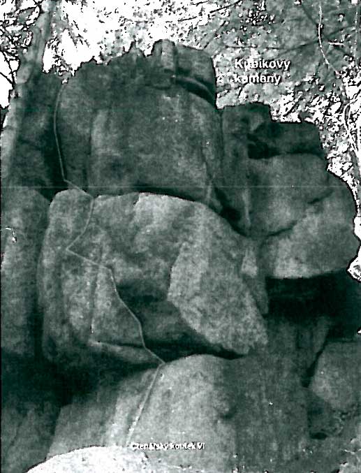 Stěnou pod převis (BH) a spárou v převise. Vlevo do spáry a jí na balkón. Vlevo komínem přes vklíněný balvan na temeno.