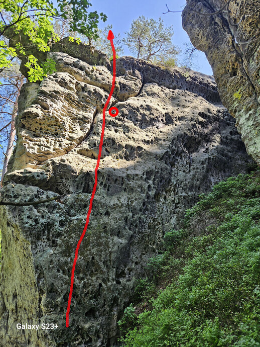 Stěnou podél šikmé spáry přes K a slaňovací K n. t.