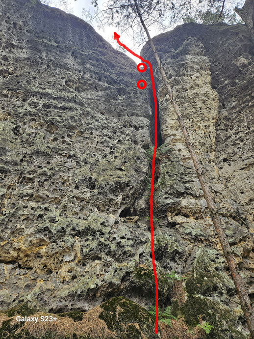 Širokou spárou přes 2 K na velkou polici a z ní šikmou stěnou přímo n. t.