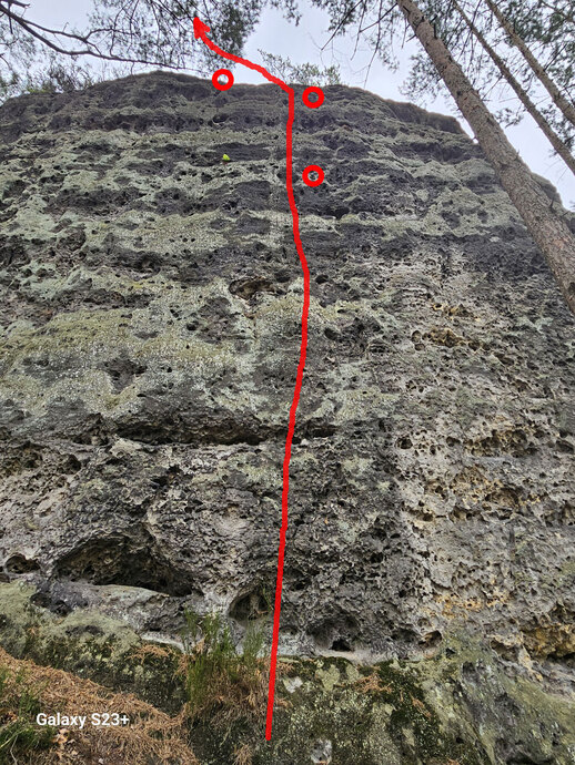 Zcela v levé části masivu stěnou přes 2 K na polici, šikmou stěnou přes 3. K n. t.