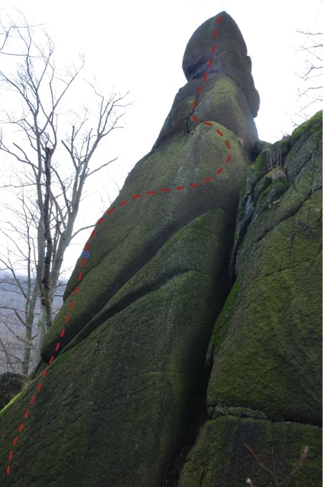 Nástup ve spádnici levé hrany pilíře nalevo od cesty Pilíř obelisku. Obtížně do šikmé police (skoba) a doleva ke hraně (bh). Překrok na hranu a těsně podél hrany (zleva hrany) vzhůru cca 3 m a dále zpět do údolní plotny a podél hrany (zprava) na temeno. Po balkonku doleva a drolivou spárou na v.