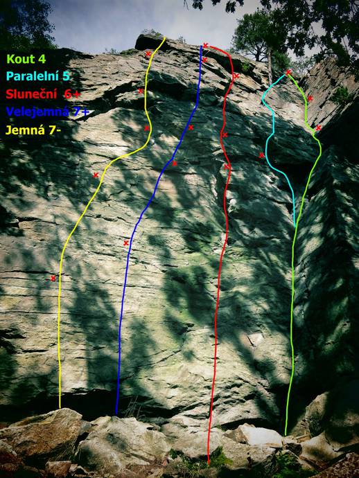 vpravo od kouta stěnou kolem kruhu ke kruhu na římse. Přímo vzhůru (jištění ve vodorovné spáře) a doprava k nýtu. Dále poněkud doleva do spáry. Převislým sokolíkem vlevo do horní části stěny (nýt) a na vrchol.