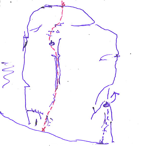 V levé části stěny ze svahu, mírně převislou stěnou do trhlin. Těmi na konec a vlevo ke kruhu, stěnou na vrchol