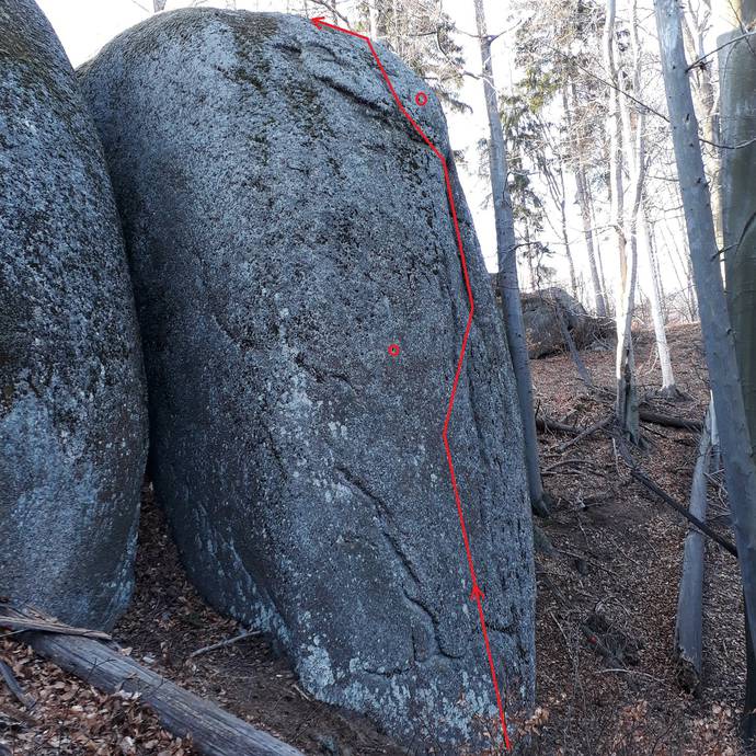 Z jihu úzkou stěnou přes BH obtížně do "V" poruchy ke 2. BH a přes něj na temeno.
