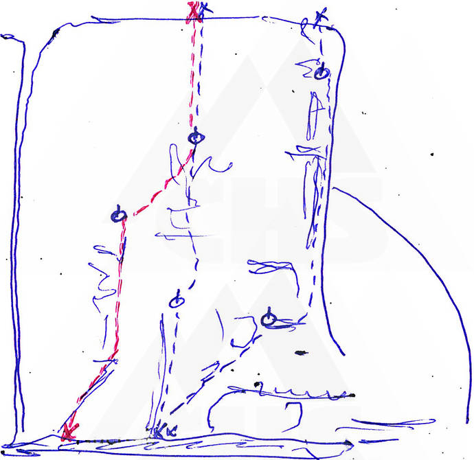 V levé části pravé stěny (z travnaté terasy) stěnou vzhůru k 1. kruhu. Stěnou šikmo vpravo ke 2. kruhu cesta "Kašpárkobraní", tou na temeno.