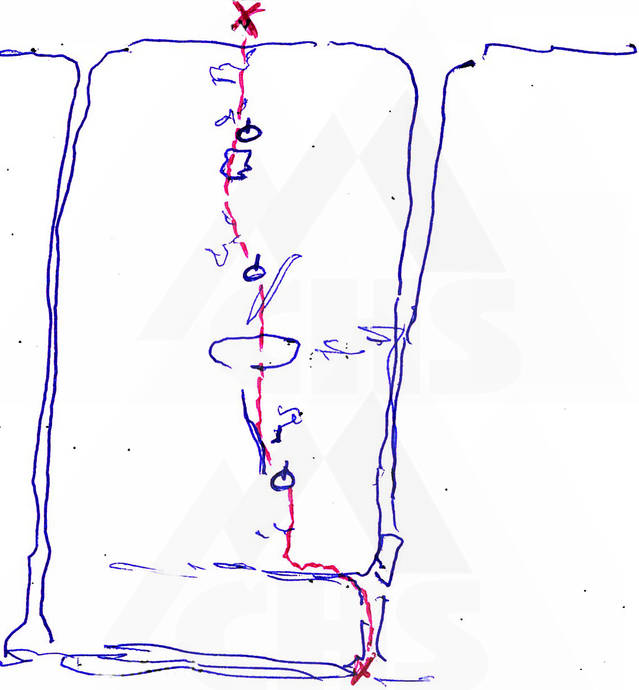 V levé části pravé boční stěny krátce komínem k římse, po ní doleva a stěnou vzhůru k 1. kruhu. Spárkou do díry\ a stěnou ke 2. kruhu. STěnou vzhůru na květák ke 3. kruhu. Stěnou přímo na temeno.