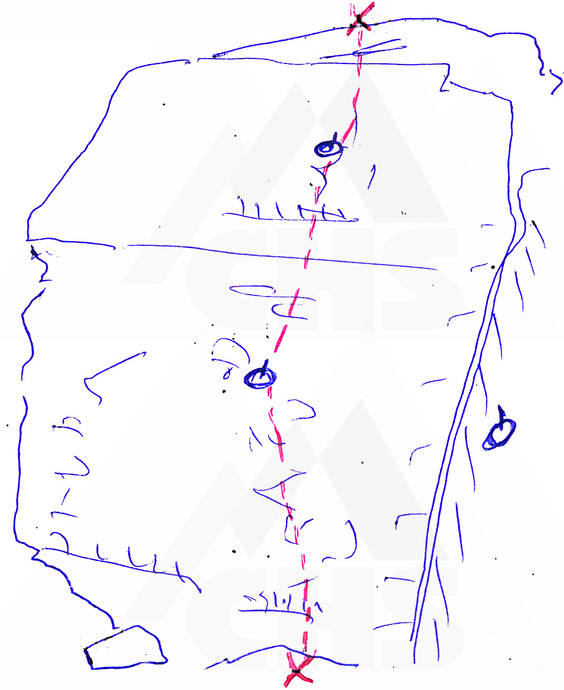 V pravé boční převislé stěně (vlevo od kouta) stěnou přes 2 kruhy vzhůru na temeno.