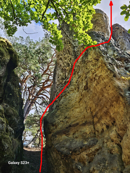 Nástup pravou boční stěnou, rozpěrným komínem mezi věží a masivem, traverz doprava na hranu a komínem cesty „Kramolna“ n. v.