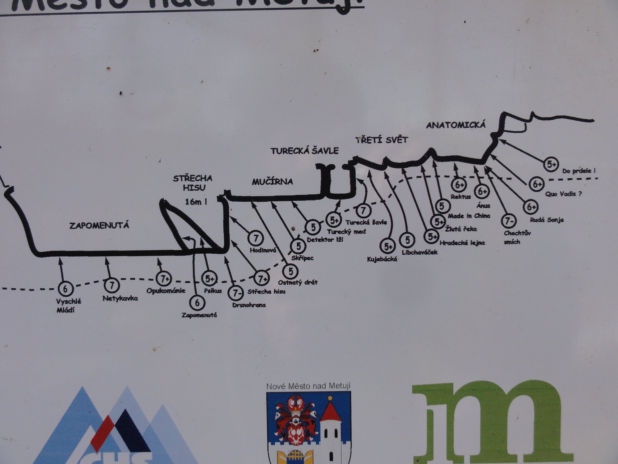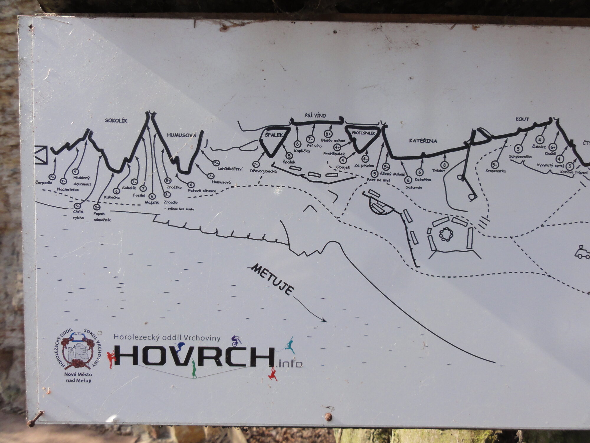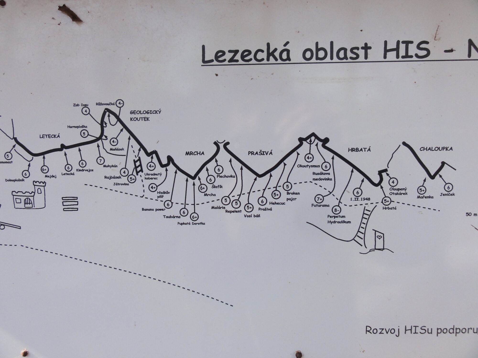 H I S – lezecká oblast Horolezeckého oddílu Vrchoviny v Novém Městě nad Metují. Skály tvoří přerušovaný pás okrajových stěn podél řeky Metuje, které lemují historické centrum města. Pro lezeckou činnost je z důvodu pevnosti skal využíván úsek cca 300m. Z geologické stránky je oblast tvořena jílovci, též označovaných jako opuka. Je zde velký výběr výstupových cest od II. do VIII. stupně místní klasifikace. Jsou zde i cesty po povinných chytech, označených barevnými body (7+ až 8+ UIAA). Cesty jsou osazeny nýty, místy kruhy. Vzdálenosti mezi jištěním jsou převážně sportovní. Stěny jsou mírně převislé, proto se zde dá lézt za každého počasí, po celý rok. Výška stěn je od 7 do 15 metrů. Lezení silové, po různě velkých lištách. Orientace na východ s dopoledním sluníčkem. Podrobný průvodce je na stránkách HOVRCH, viz. odkaz níže. Od roku 2006 probíhá celková obnova a doplnění fixního jištění a slaňovacích řetězů. Jsou zpevněny přístupy ke stěnám a upraveny nástupové plochy pod stěnami. V oblasti je místo pro posezení a „dětský koutek“.