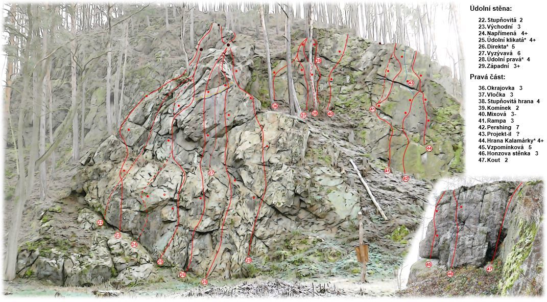Na skálu vedlo 35 cest, které se většinou lezly klasicky s použitím vlastního jistícího materiálu. Pevných jistících bodů – skob bylo ve skále jen pár.