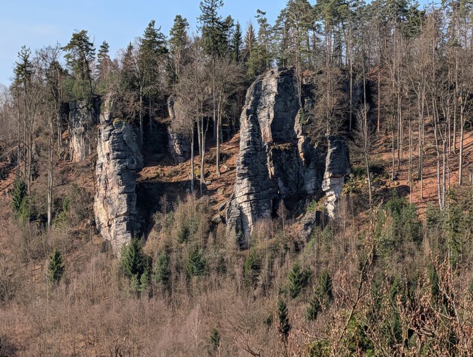 Ochrana přírody: skála uzavřena od 23.2. do 30.6. kvůli hnízdění čápa černého a sokola stěhovavého.