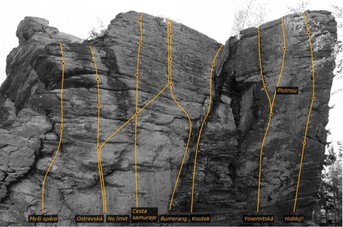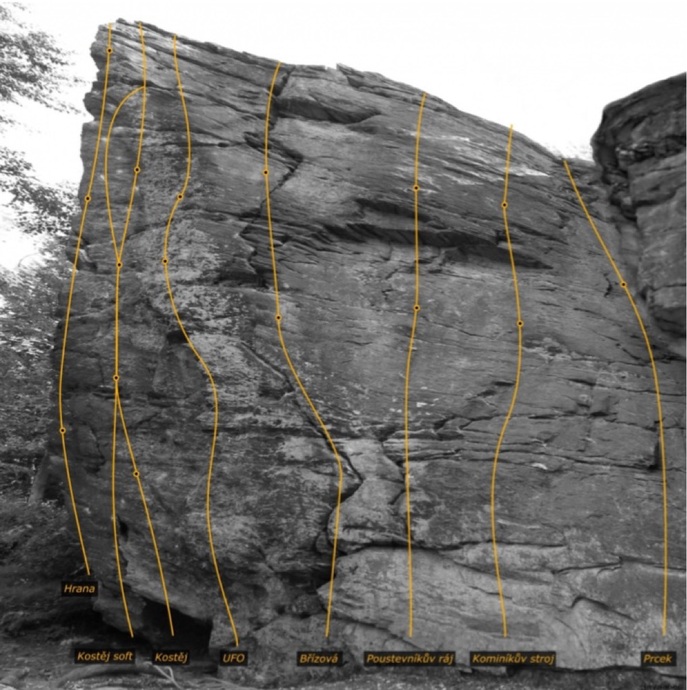 - Cesta po lištách v převise. Boulderový problém u Kostěje se oblézá zleva. Zpět k prvnímu borháku. Zbytek stejně jako Kostěj.