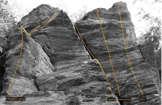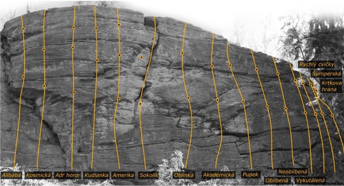 - Přes dvě jištění mírně vlevo. Cesta úplně v pravé části skal. Vhodné pro začátečníky.