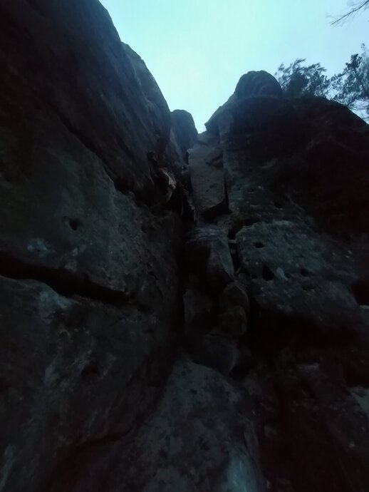 - Vpravo v J stěně trhlinou šikmo doleva na římsu, tou doleva a komínem na vrchol.