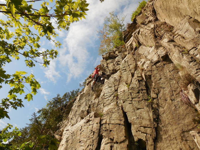 - Mírně převislou stěnkou pod převis (bh) a vpravo podél šikmé žíly k hraně převisu (bh) a vzkůru na vrchol. (Přejištěno 9/2019, dříve lezeno 5 A2).