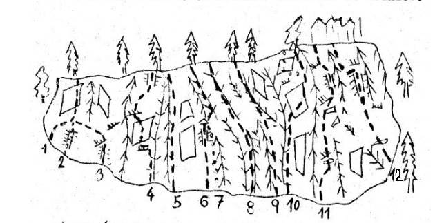 - Nástup na pravém okraji skal. Stěnou do komína, komínem pod převis, traverz doleva na plošinu a vhloubením n. t. (č. 12)