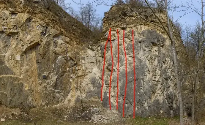 - Poněkud vlevo v sektoru. Stěnou, krátkou výraznou spárou a přes převísek na konec.