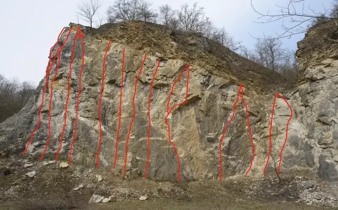 20)Tříprsťák, ***, 7+/8-, 12m - Kolmou stěnou s vrcholovým boulderem.