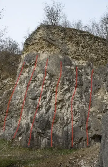 - Nástup mírně vlevo od prvního nýtu, potom rovně přes převis k řetězu. Název na skále.