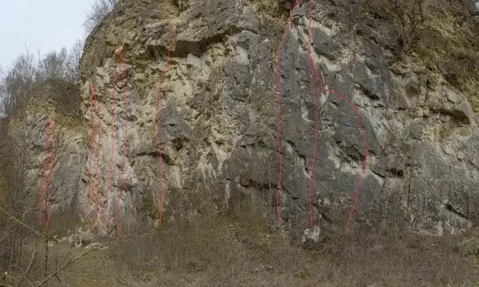 - V zadní části lomu vedou 2 cesty na poněkud oddělený masiv, pak následuje 6 cest těsně vedle sebe, toto je první z nich, celkově 3. , vzato odleva.