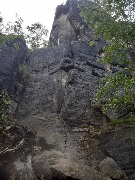 • Asi 20 m nalevo od Duhové věže z velkého kouta stěnou přes díry (hodiny) ke K a dále ke slaňovacímu BH