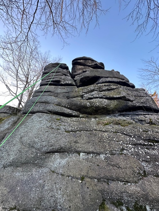 - Ze spodního patra přes 2 borháky na vrchol. Varianta od prvního jištění logickou linii doleva.