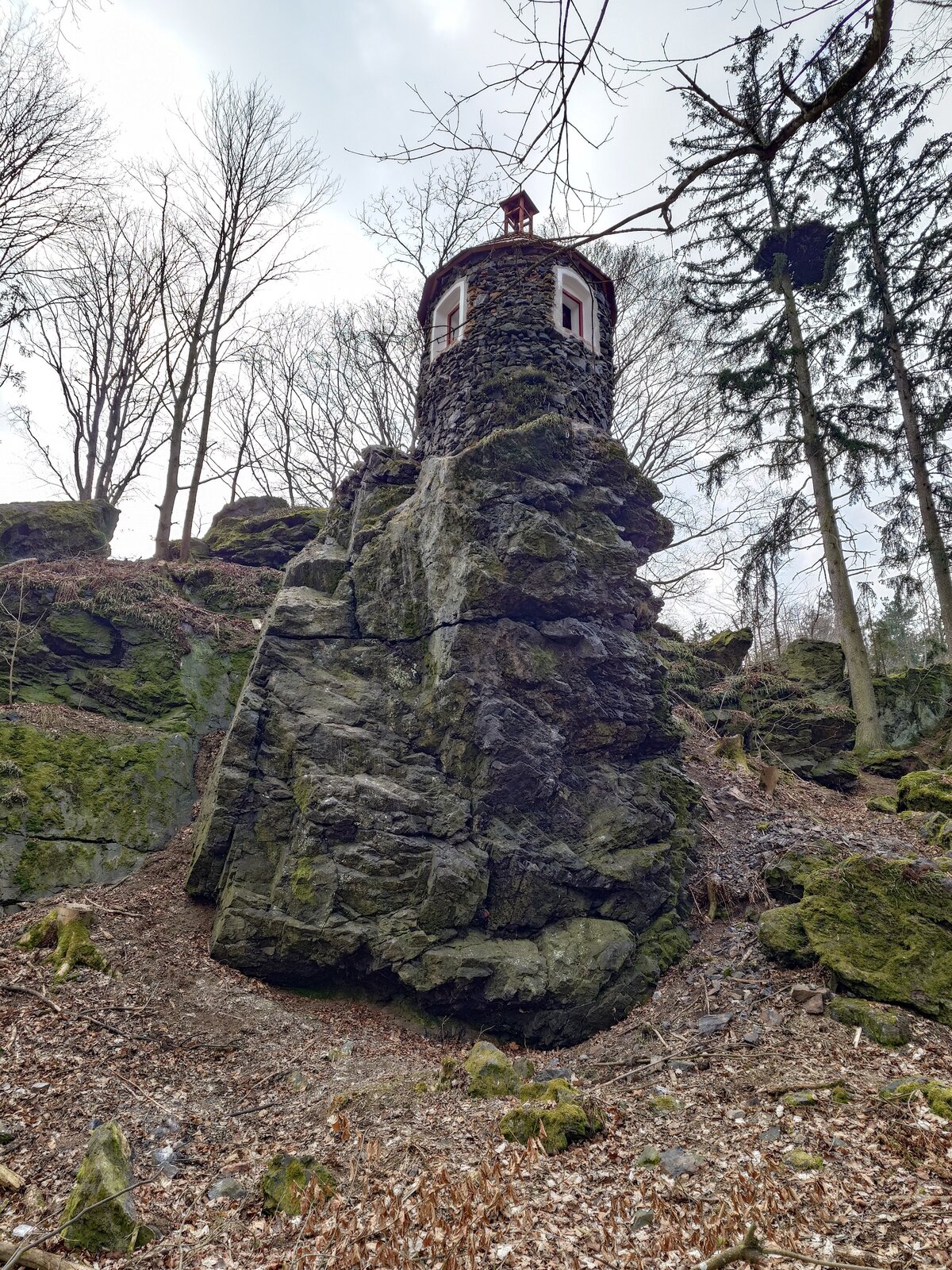 - Levou částí stěny (bh) útvaru s vyhlídkovým altánem. Ke štandu (2 bh + karabina) nebo až na vrchol.
