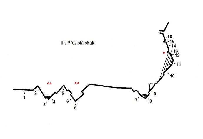 - Šikmo doleva ubíhající lavicí (bh) pod strop převisu. Doleva na polici, přes převis (bh) a stěnkou na vrchol (bh s karabinou).