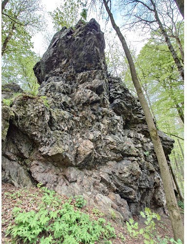 Hlavní převislý útvar o výšce do osmnácti metrů. Na vrcholu jištění u stromů. Možno slaňovat, či scházet.