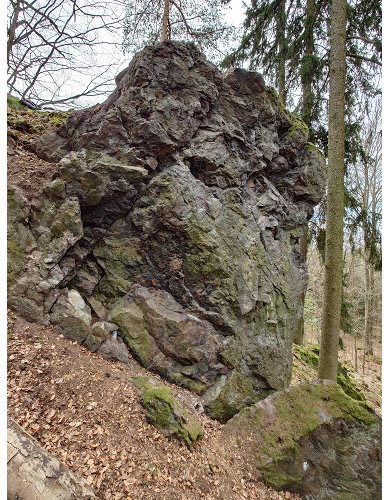 - Mírně šikmo doprava vzhůru údolní stěnou (bh) a kolem velkého dunivého bloku (bh) na vrchol.