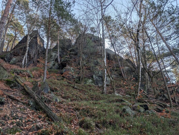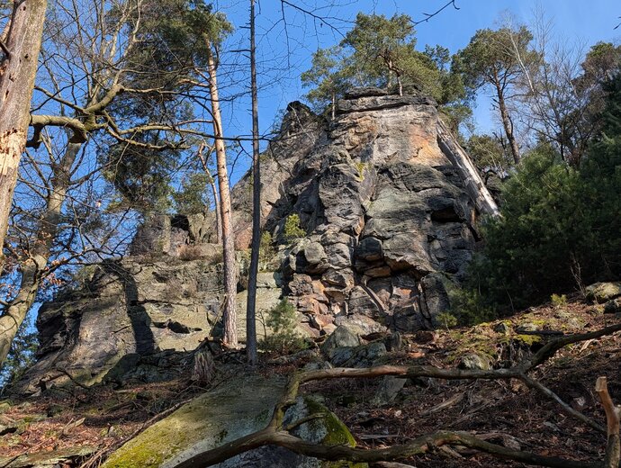 Král Slunce, AF VI, RP VIIa, 15m - Ve východní stěně trhlinou (smyčky) a žebrem k 1. BH. Přímo k 2. BH a stěnou při hraně ke slanění.