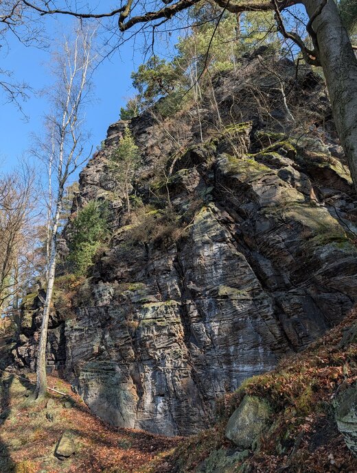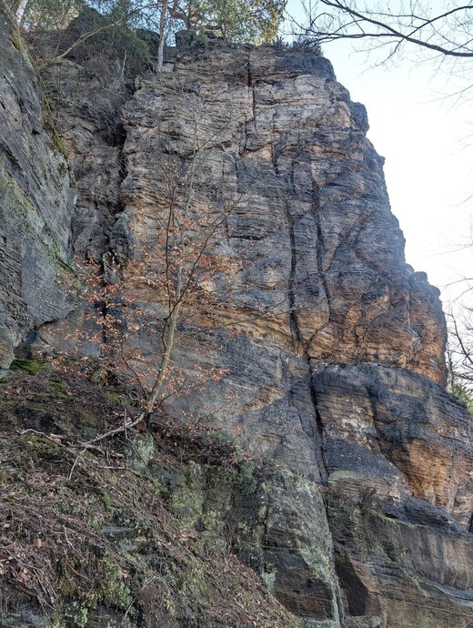 - Asi 5 m vpravo od cesty Příběh života stěnou podél spáry přes terasu až na konec (hodiny, uzel) a stěnou přímo na vrchol (slanění).