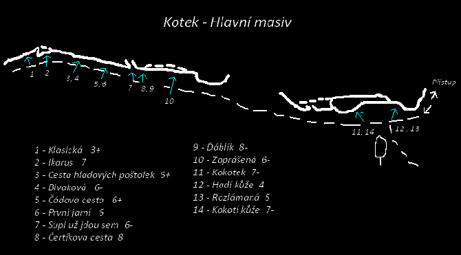 - Stěnou do díry a traverz doprava (nýty) až pod převis k řetězu. První průstup stěny Kotku. Při prvovýstupu autoři z rozmaru v díře (kniha) bivakovali na dvou skobách!