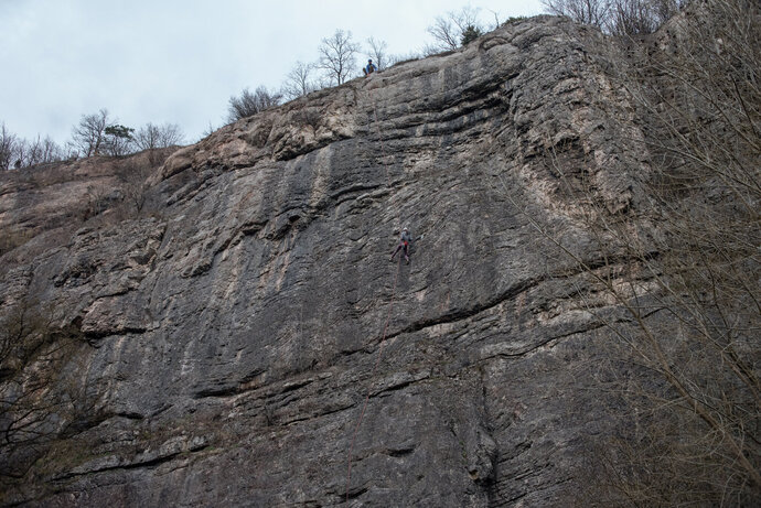 - Na rampu přetínající celou stěnu lehce zleva. Více-méně pěšky doprava až ke kruhu před hranou, poté několik těžších kroků do kotle, jím šikmo doprava a zpět doleva pod kolmou stěnku (kruh). Na temeno ke stromům.