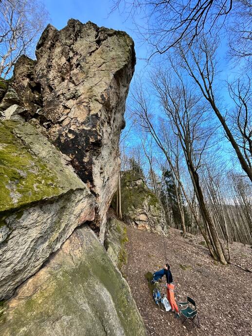 Osamělá skála stojící na okraji lesa, asi 1 km severně od Křižan. Lezecké aktivity zde započaly až po r. 1990. V jižní, až 20m vysoké stěně, vedou výstupy, udělané po vzoru sportovních cest na nepískovci, osazené borháky. Vzhledem k rozporu vykonání těchto prvovýstupů s platnými Pravidly, nejsou uváděna jména prvovýstupců (resp. prvopřelezců).