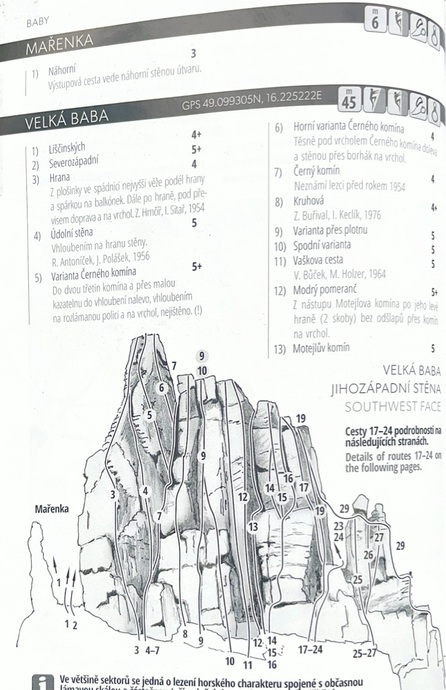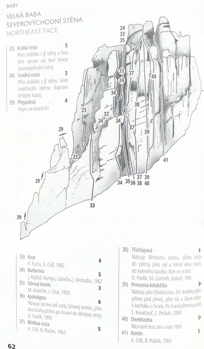- Cesta vede ve východní stěně Velké Baby. Nastupuje se cestou Zahrádky (Diretissima). Od druhého borháku této cesty přímo pod převis. Dále přímo přes něj a pak šikmo doleva k borháku u hrany, po hraně přímo na vrchol. Délka 30 m. Nástup stejně jako Direttissima. Od druhého jištěn…