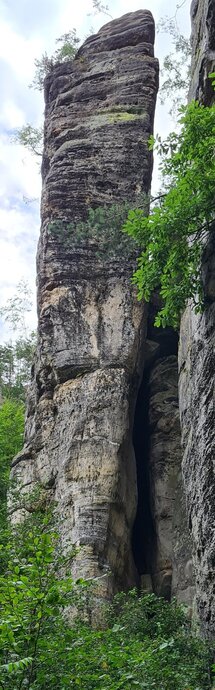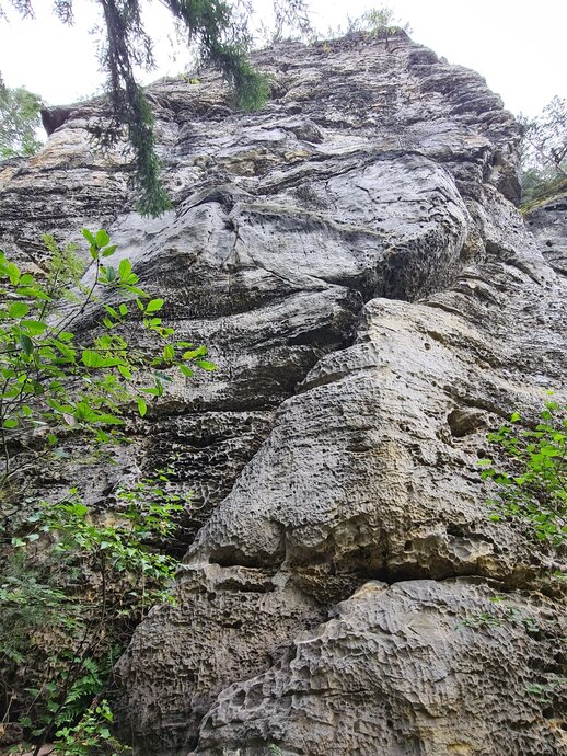 - V úzké východní stěně přes převis a jemnou spárou na polici. Traverz vpravo ke kruhu a stěnou přímo na vrchol.
