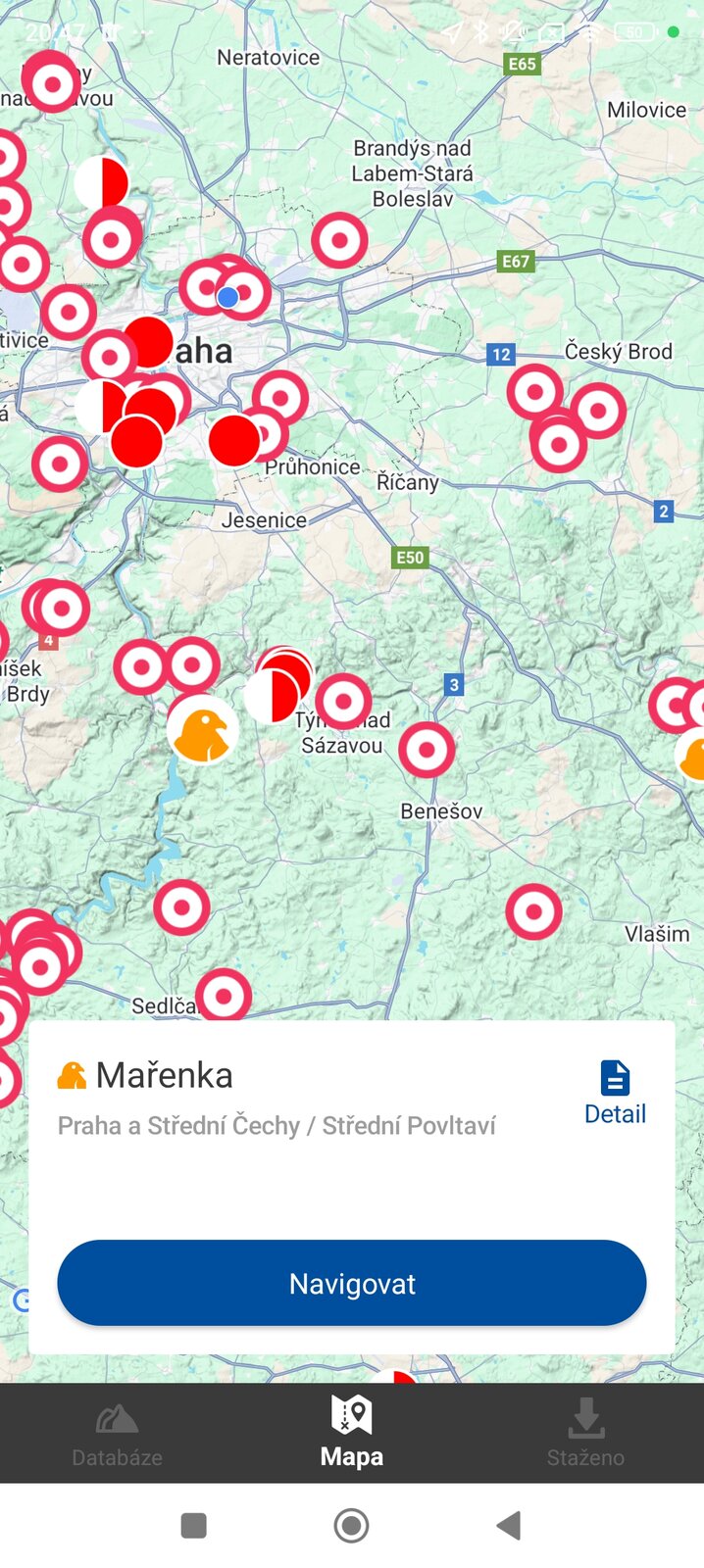 V dolní části obrazovky jsou tři základní ikony, které určují režim aplikace, a sice Databáze, Mapa a Staženo.