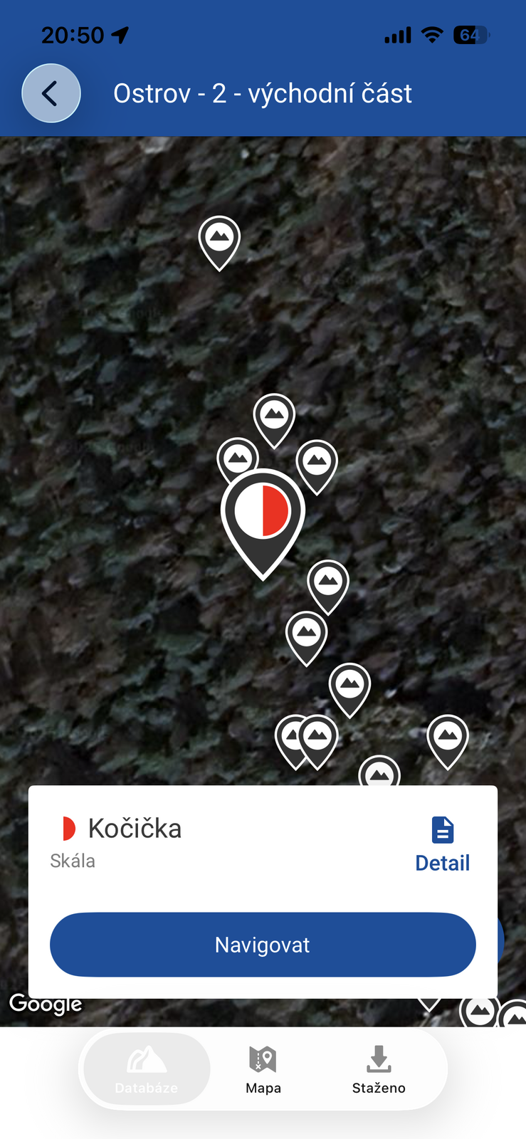 Ťuknutím na ikonku skály lze vyvolat její detailní stránku, nebo tlačítkem Navigovat vybrat některou z navigačních aplikací, kterou si můžete u Androidu tlačítkem „Vždy” nastavit jako výchozí pro celou aplikaci. Asi jako nejvhodnější se zde nabízí mapy.cz, kde je možnost stáhnout si pro offline provoz mapy i s polohami skal.